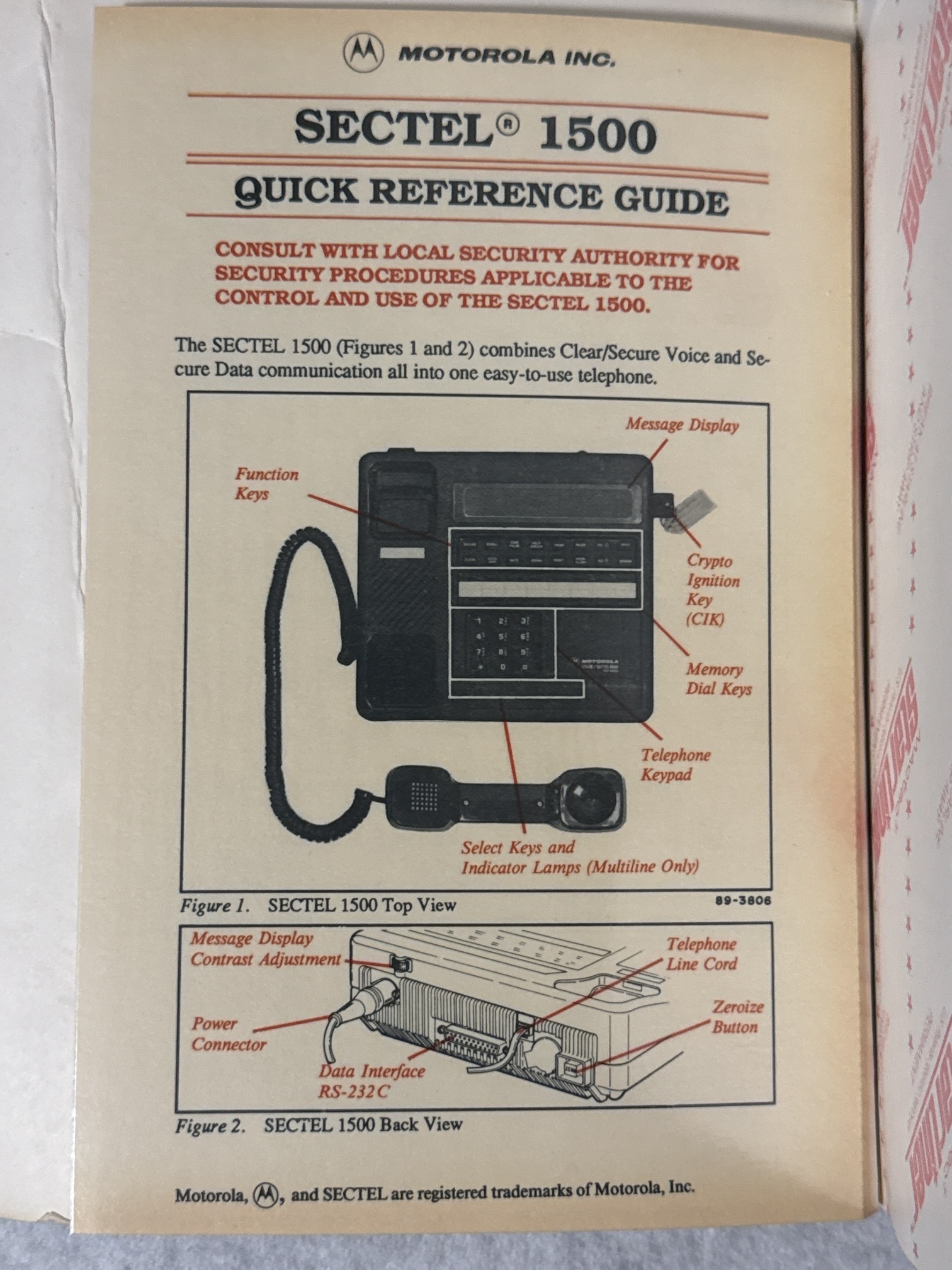 | Description | Paperback, black and gold cover with full-color photo of the Motorola STU-III secure telephone. October, 1989. Rear cover is creased. There are two paperclips marking pages. Includes a return label (for the STU) and a fold-out quick-reference chart, both bound at the back. The STU-III was the primary encrypted telephone in used by the US Government from 1987 until it was replaced by the STE (see: L-3 Communications Secure Terminal Equipment (STE - Office)) by 2008. See also: Power supply for Motorola STU-III. |