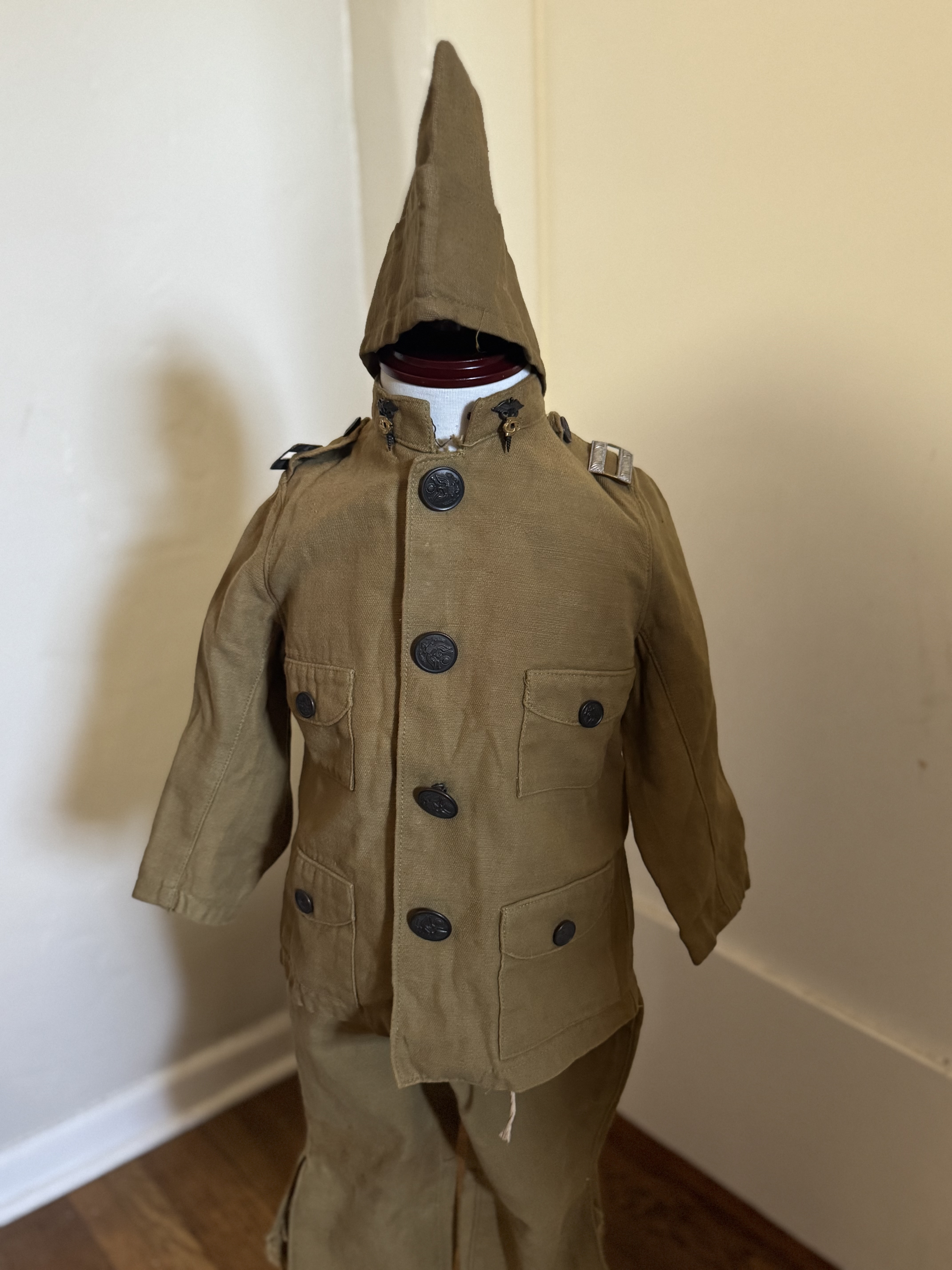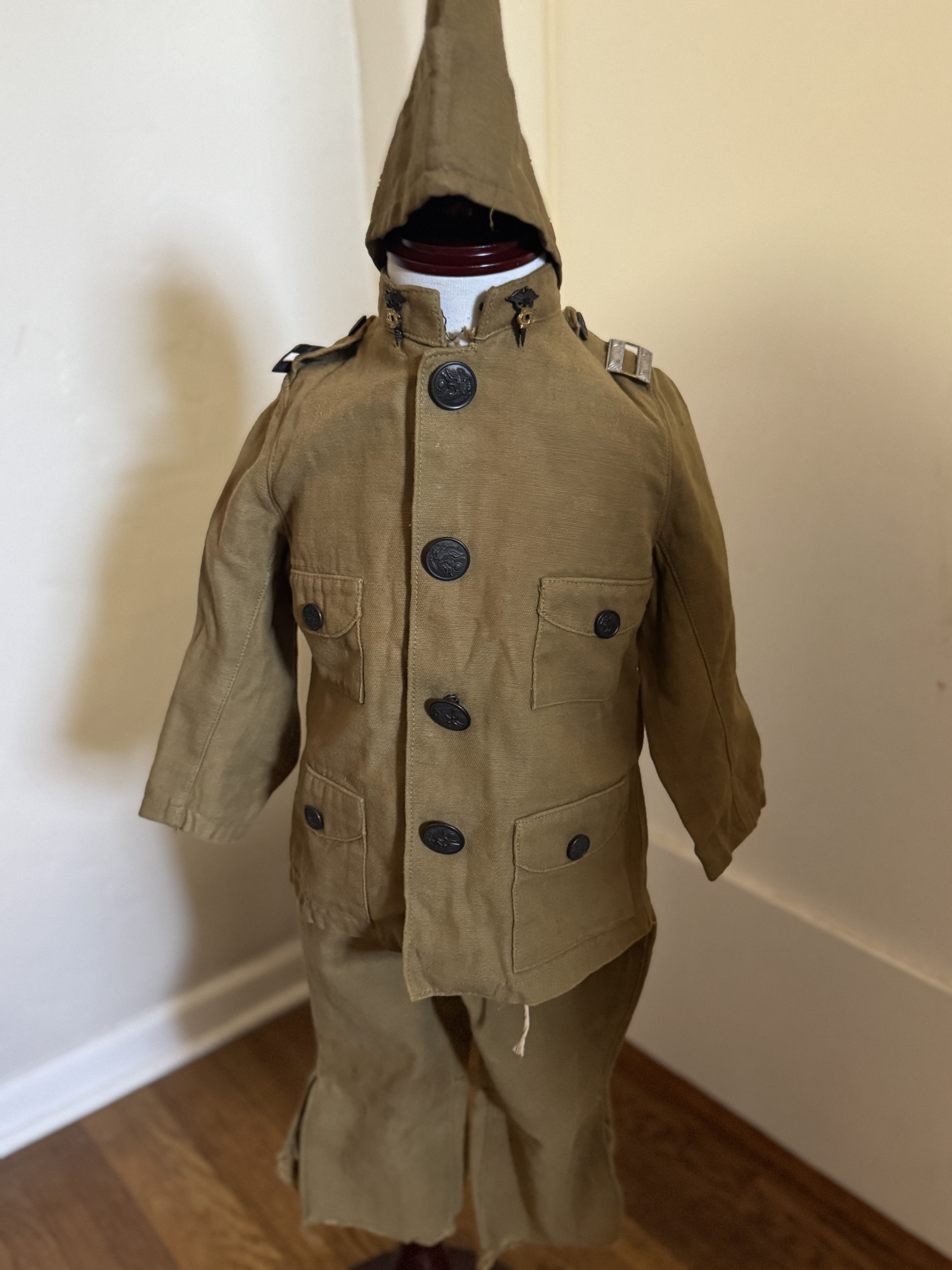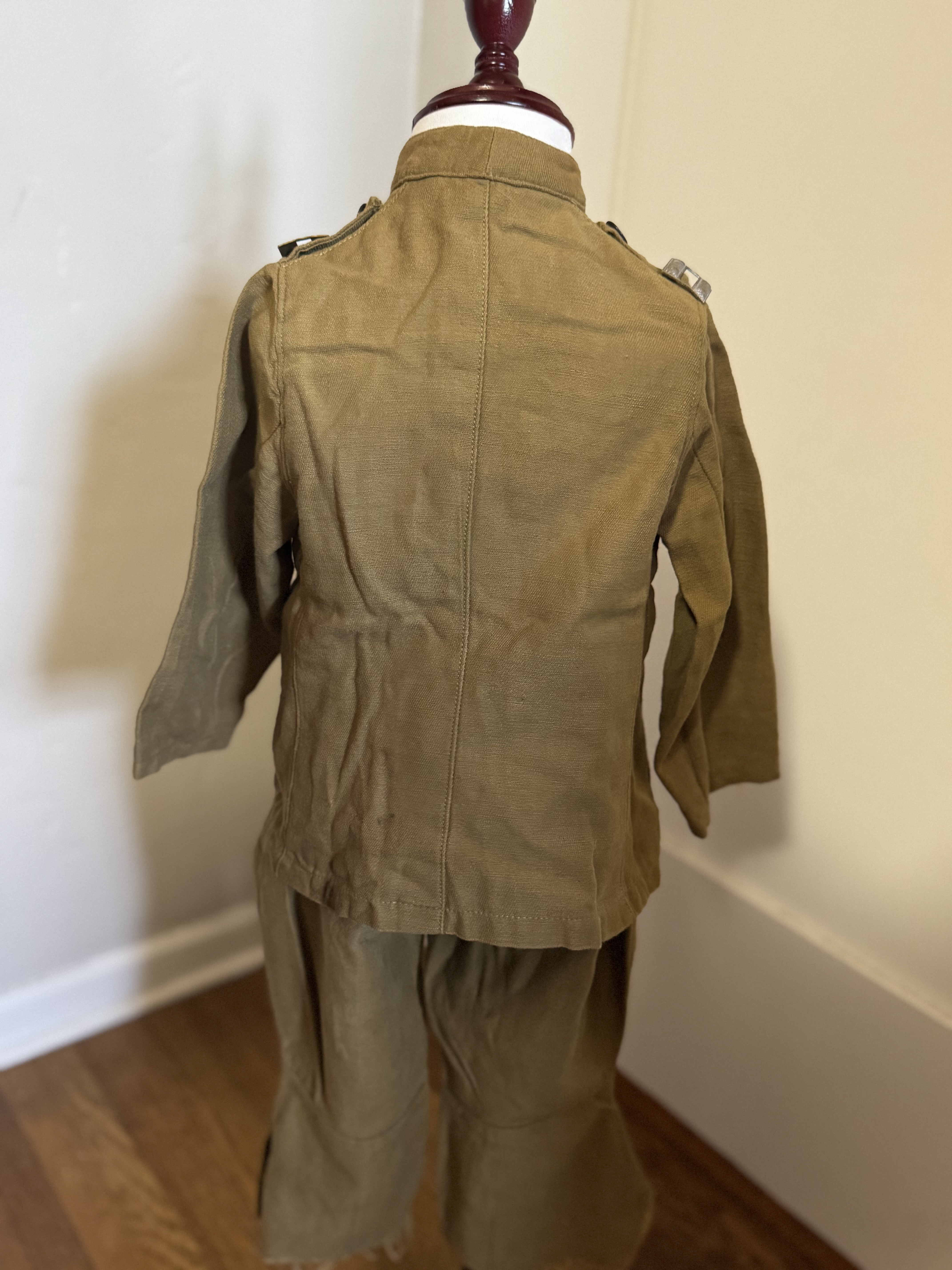 A homemade, 4-pocket tunic with epaulets and standing collar, for a very young child. Simple breeches and overseas cap, all unlined. Tunic has four faux patch pockets. Four button front, with dark bronze Scoville buttons. Front closes with snaps, with buttons simply sewn to the front, with bent loops. Plain cuffs. Collar has a single hook and broken eye.
