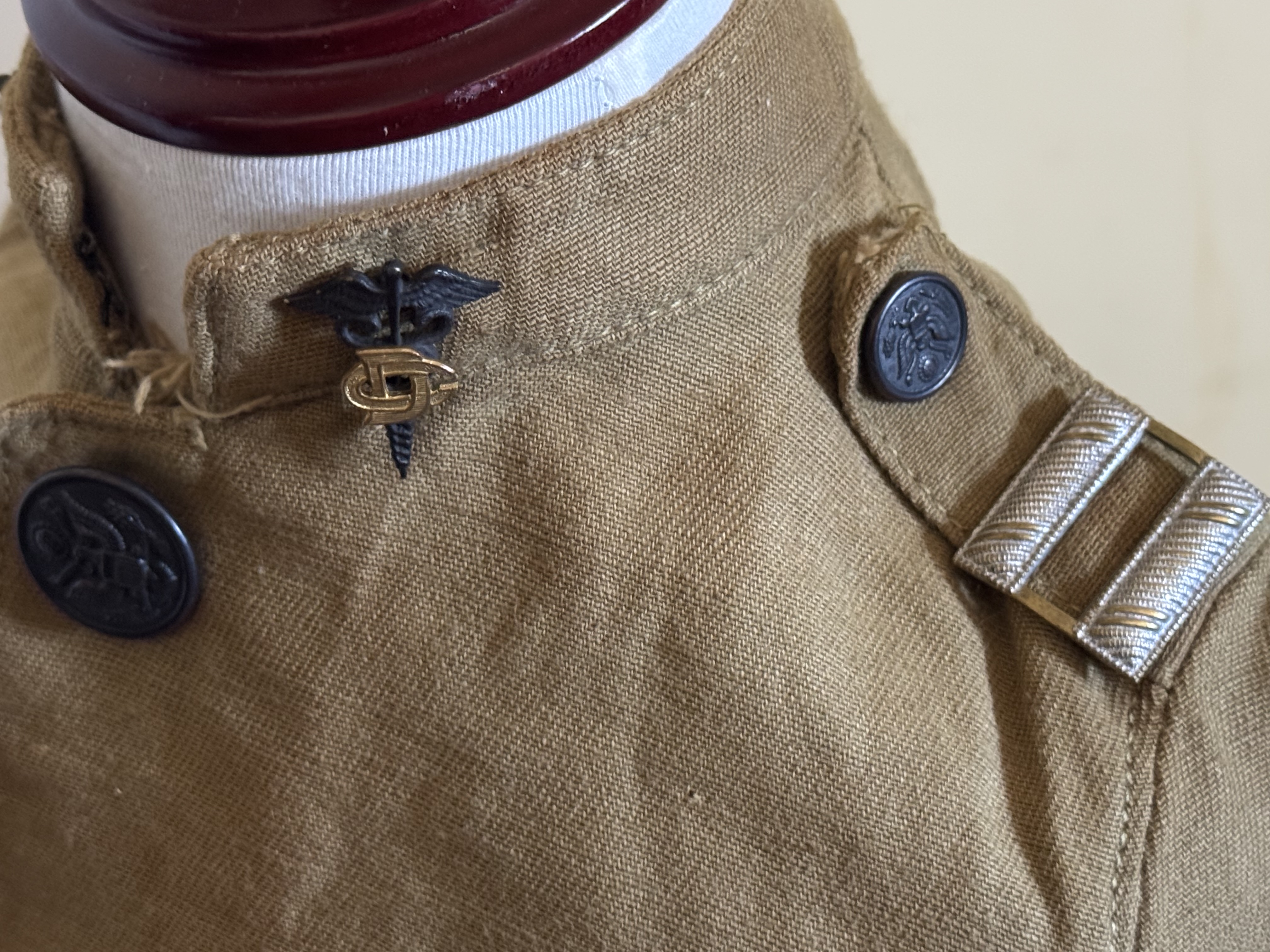 Each side of the collar has an unmarked, pin-back, blackened cadacaus with a gilt "DC" cipher in the center, for Dental Corps. On the epaulets are faux-bullion silvered-brass pin-back captain's bars.