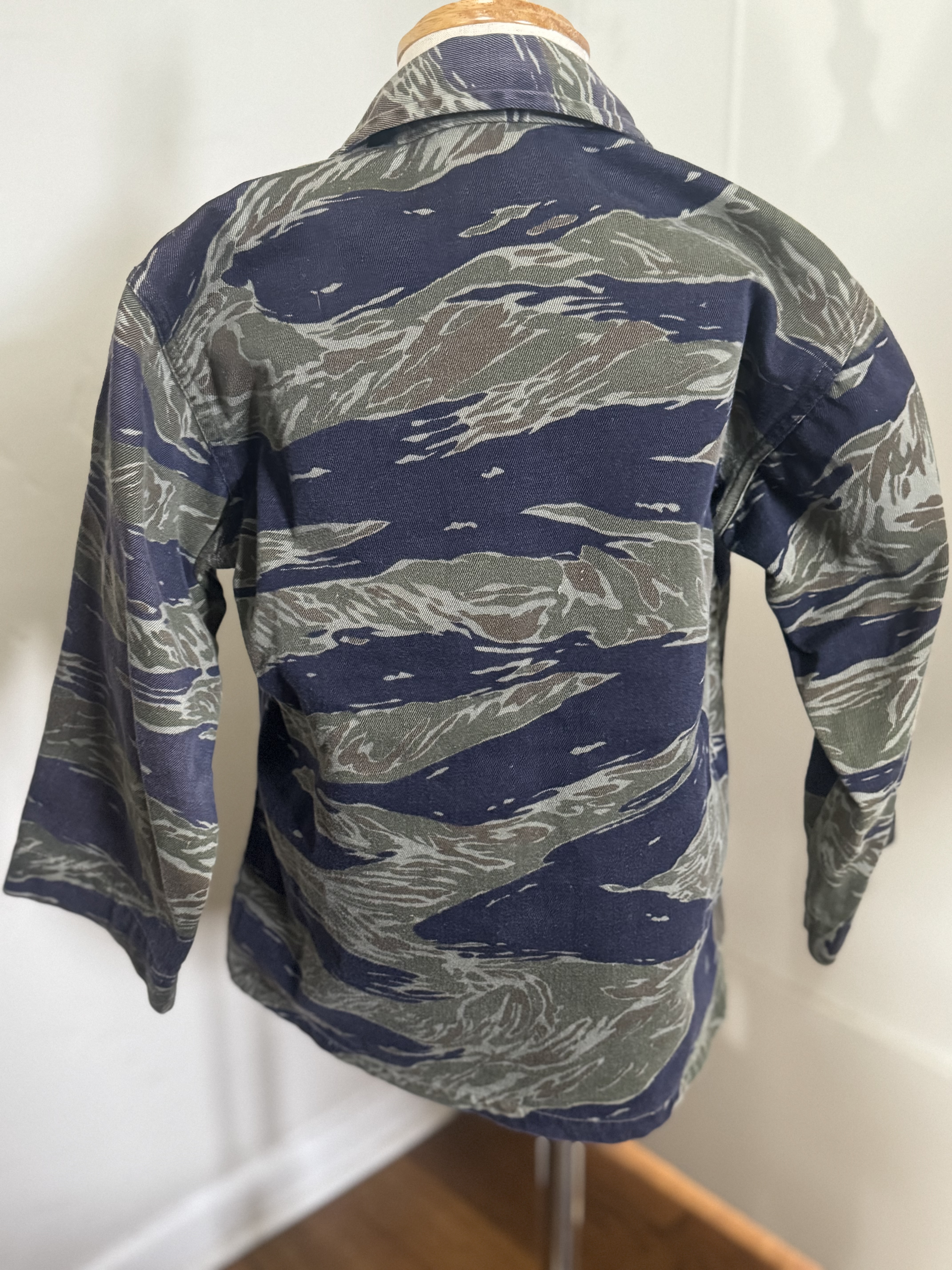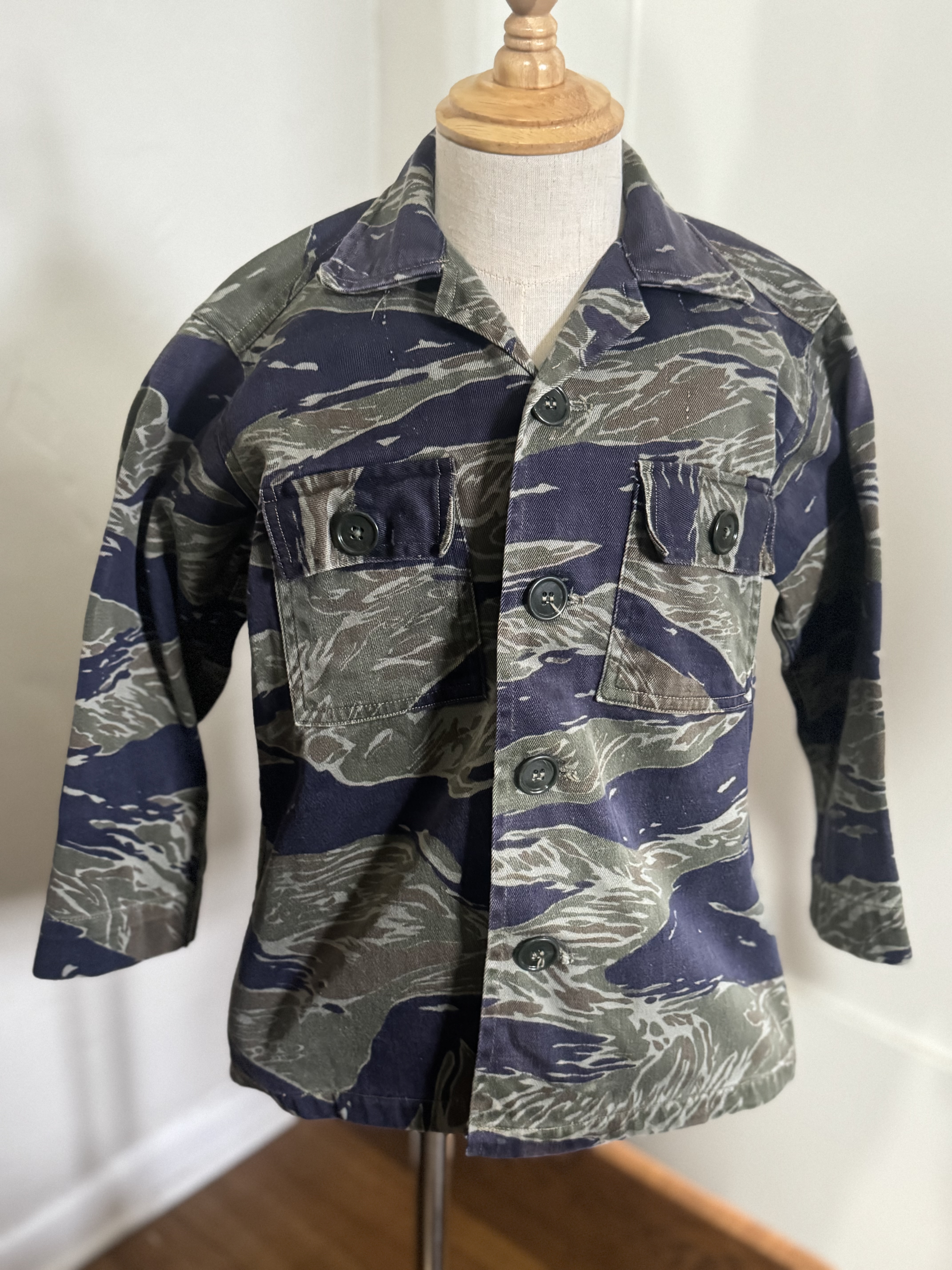 | Description | Child's two-pocket, 4-button tiger stripe shirt. Heavy cotton. Unmarked. I believe this is printed in Tadpole Sparse Pattern (TDS), see "Tiger Patterns", Sgt. Richard Denis Johnson, page 149, where the right side of the top photo is the same area as the back of this shirt (upside down). |