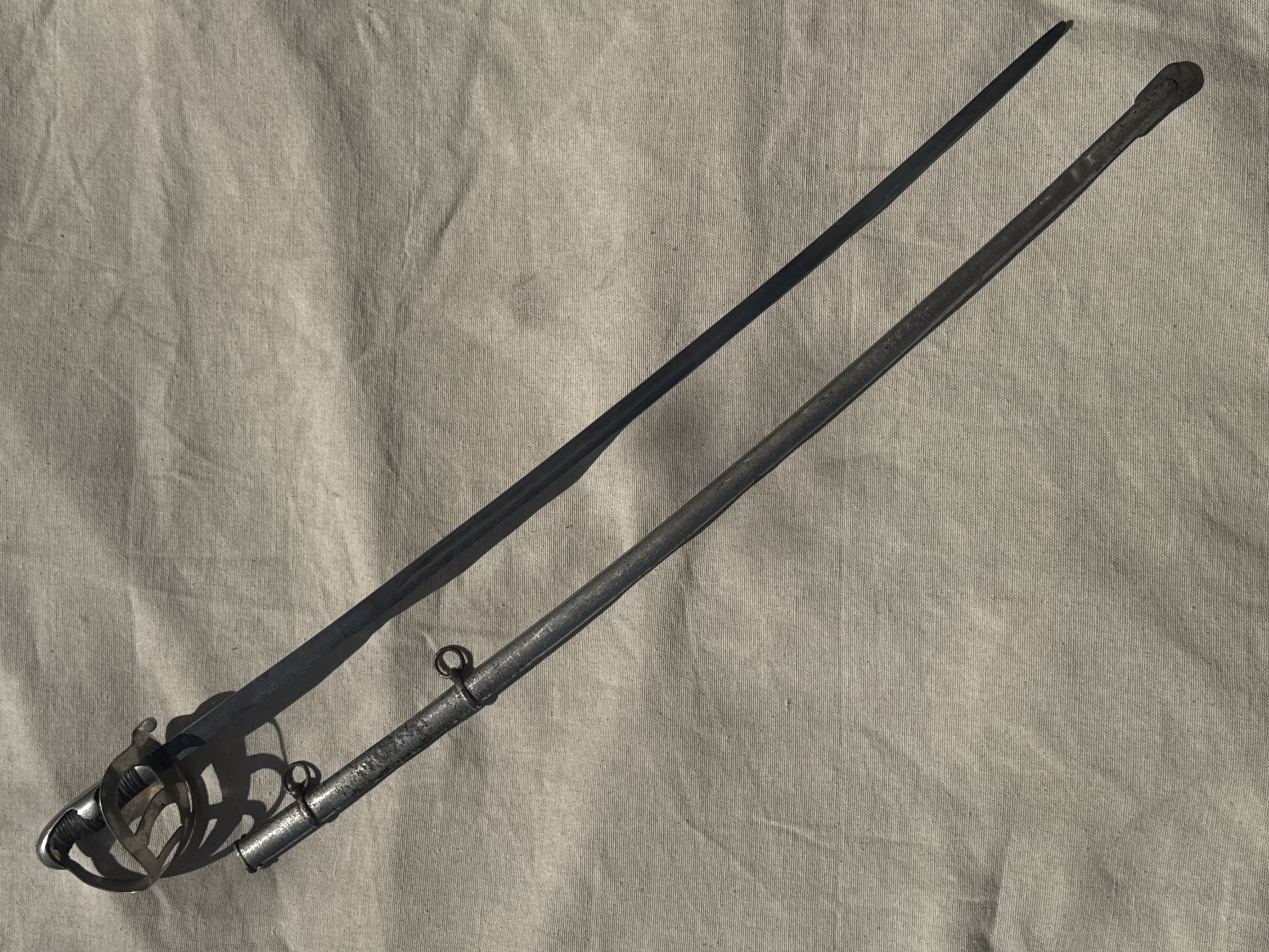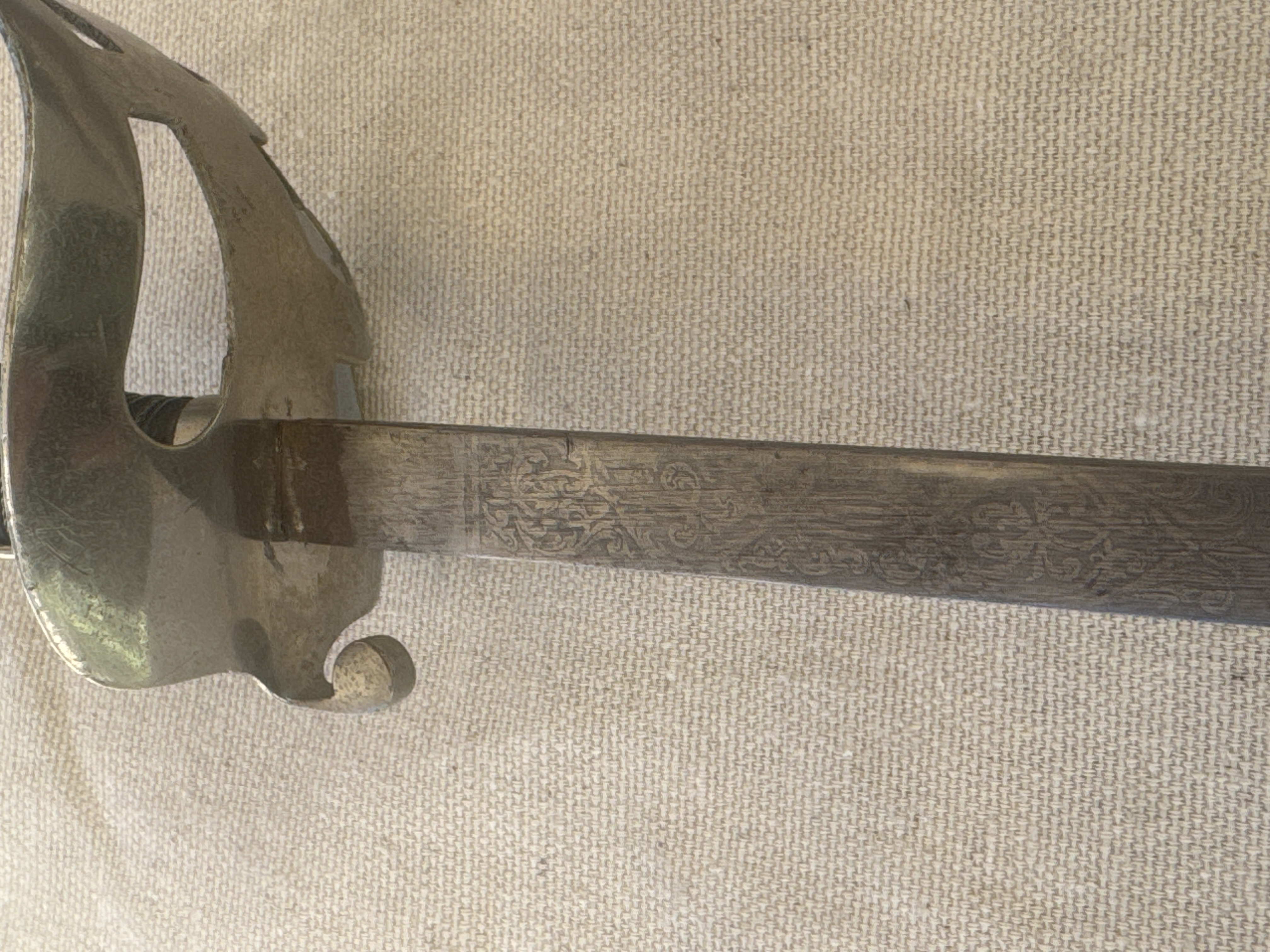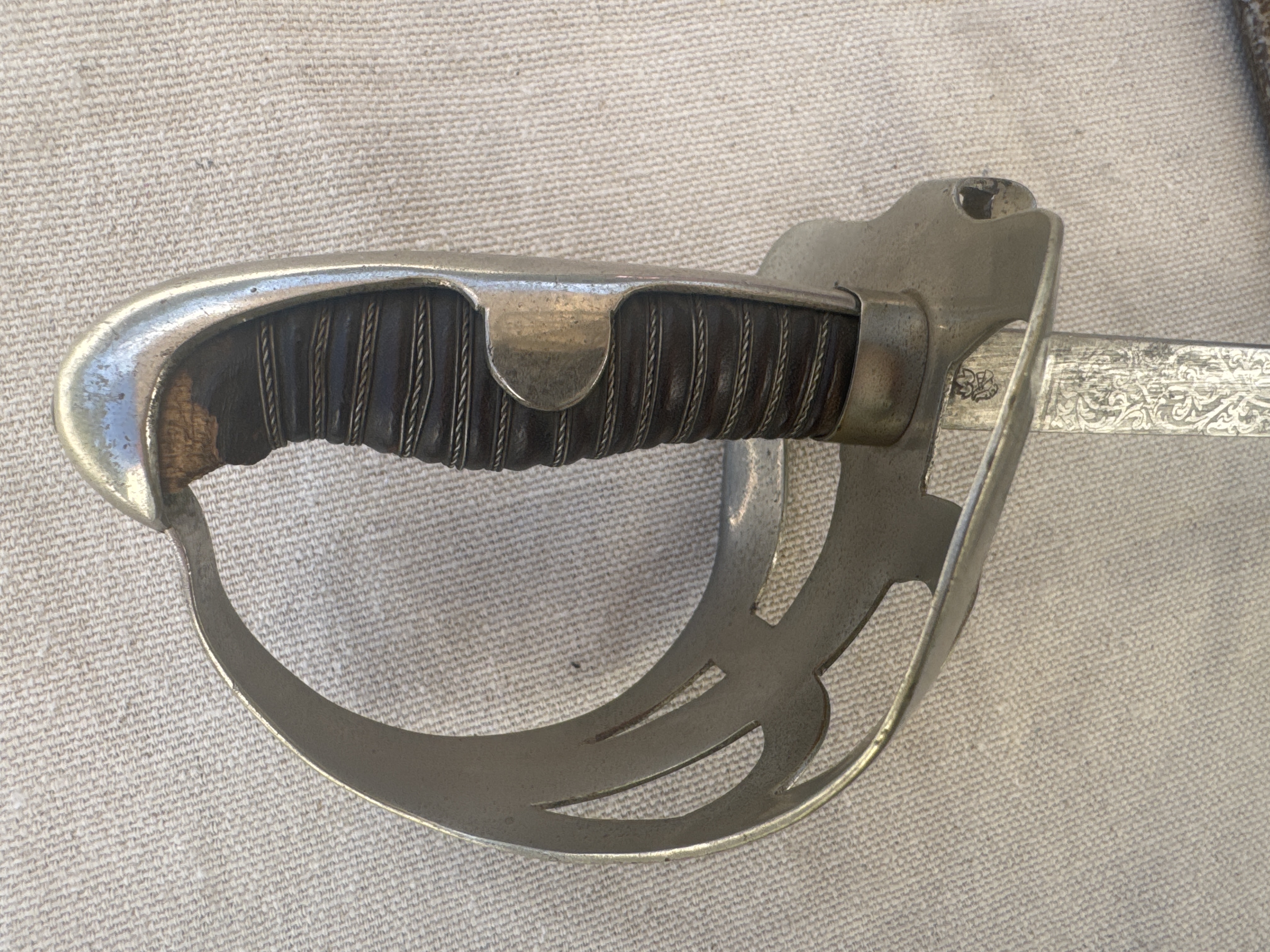 | Description | A child's saber. nickel-silver hilt, with wire-wrapped leather handle. Curved blade is etched halfway down on both sides, hand has a fuller on both sides, mid-blade. Tip is blunt. The scabbard is nickel plated, with 10% rust, and two rings. The end of the scabbard is bent. Sword blade is darkened, and leather handle has some missing spots, revealing cord underneath. Helmet logo of WKC stamped on one side of the blade Similar hilt to Imperial German steel-mounted child's sword (Kindersabel). |